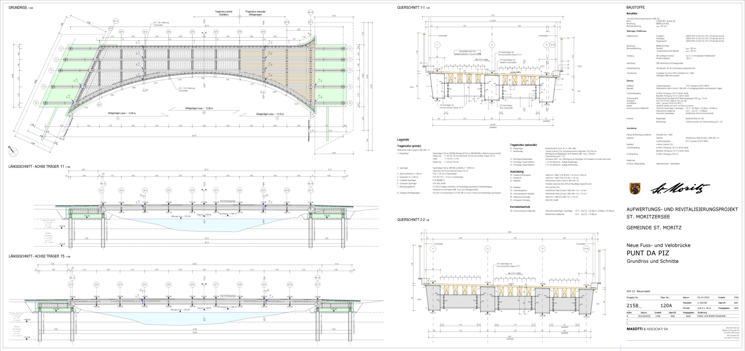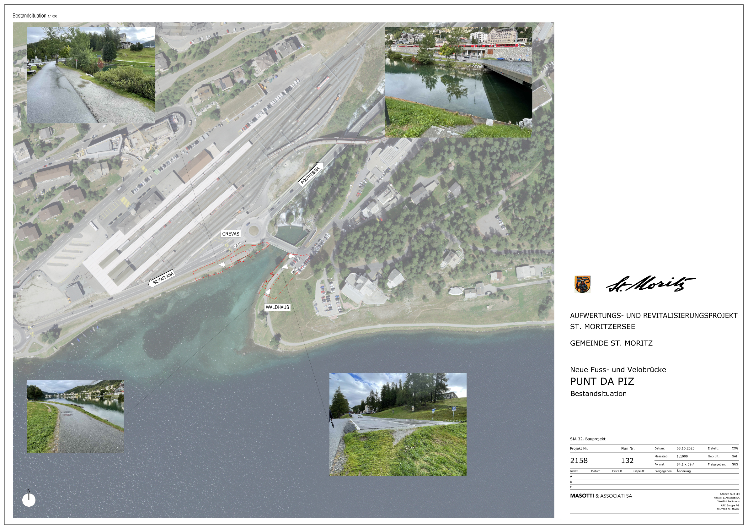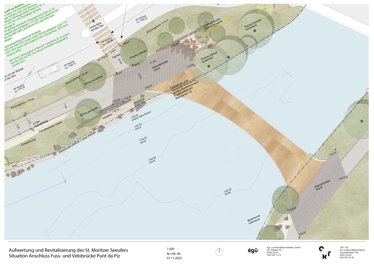 In Zusammenhang mit dem Bau des Kreisels „Dimlej“ wurde während der Bauzeit eine zwischen Punt da Piz und der Seeuferweg provisorische Brücke für den Langsamverkehr erstellt. Diese Verbindung wurde sehr gut angenommen und führte zu einer wesentlichen Verbesserung der Verkehrssicherheit im Bereich der Via Dimlej / Via Grevas (H27). Daher wurde entschieden eine permanent Verbindung in das Projekt „Aufwertungs- und Revitalisierungsprojekt“ aufzunehmen. Für die Umsetzung des Teilprojektes „Fuss- und Velobrücke Punt da Piz“ wurde ein zweistufiges Wettbewerbsverfahren durchgeführt. Der Projektvorschlag „Balcuns sur Lej“ von Masotti & Associati SA, Bellinzona mit ARX SA, St. Moritz, wurde als Siegerprojekt gekürt. Das Projekt wird weiterentwickelt und in die Aufwertungsetappe I (Kreisel Dimlej – Kreisel Bahnhof) eingebettet. Beide Projekte sollen gegen Ende Jahr den kantonalen und kommunalen Bewilligungsbehörden zur Prüfung vorgelegt werden.